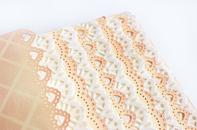 Un centrino per dolci è utilizzato anche nella pagina anteriore e, insieme ad altri dettagli raffinati come perle, strass e nastri di raso ed organza, contribuisce a dare un tocco di eleganza al progetto: